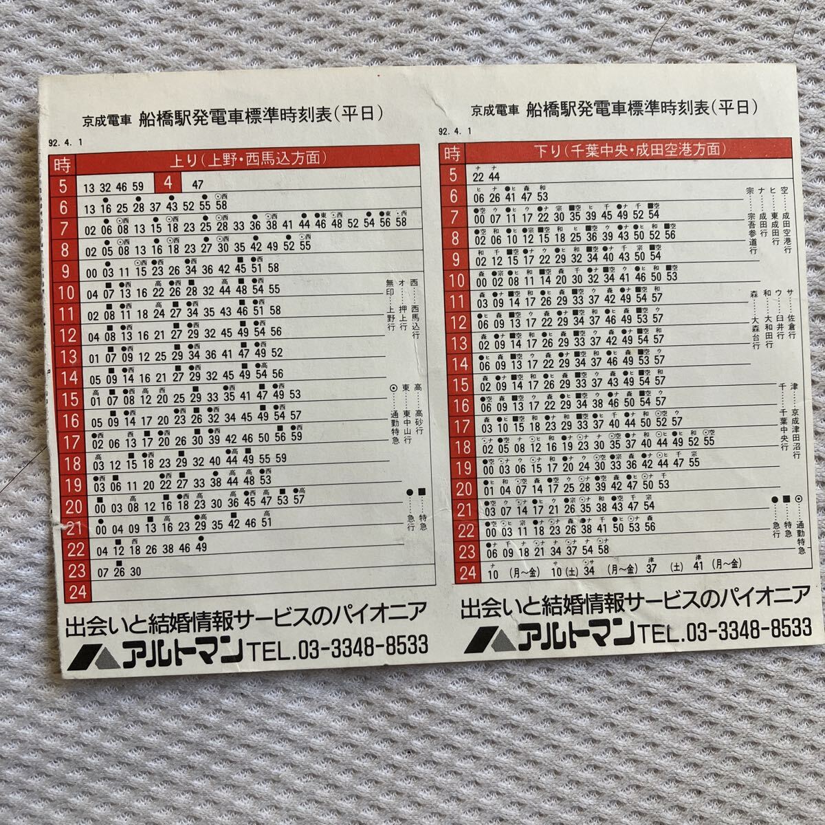 - 【1992年4月1日】京成電車船橋駅ポケット時刻表 アルトマン