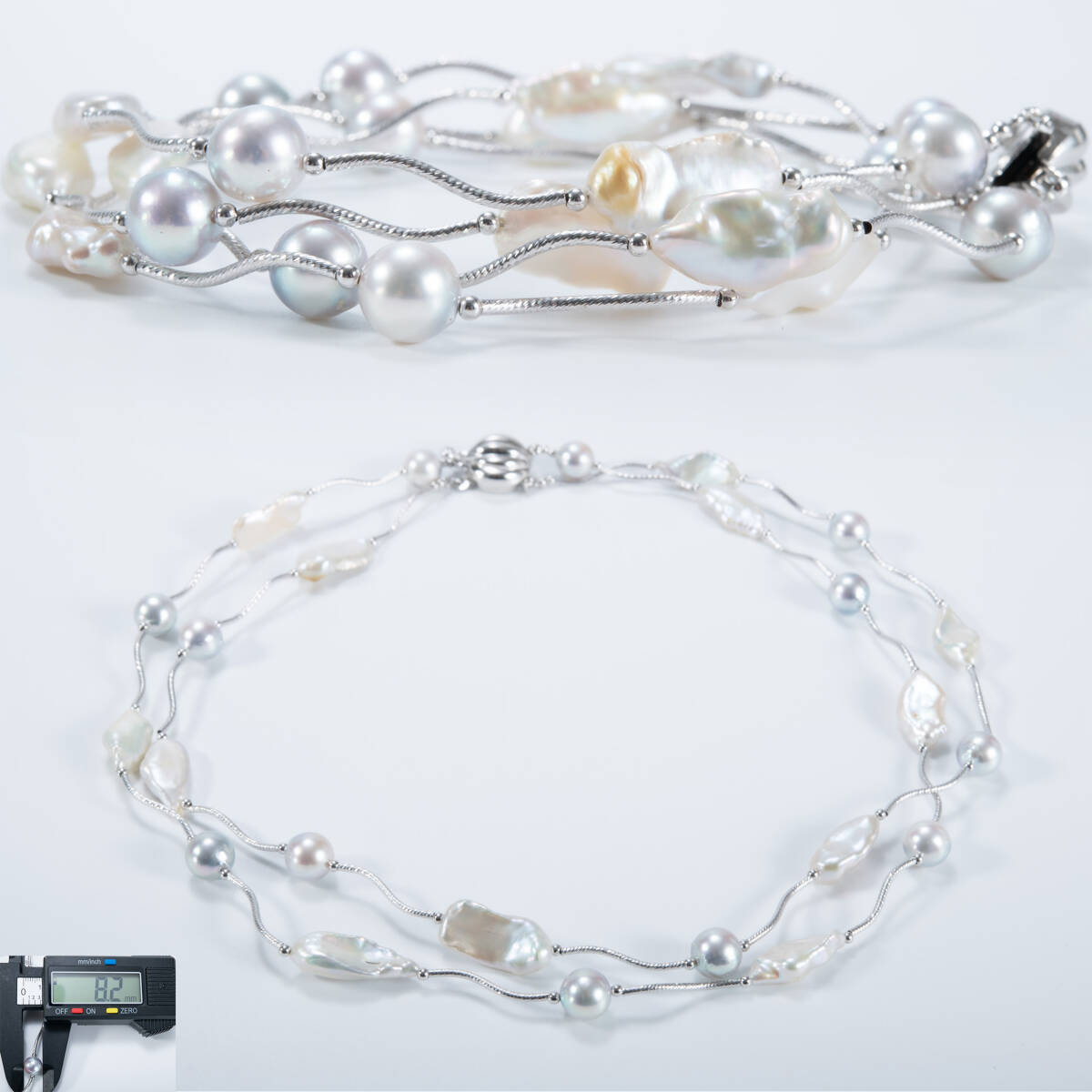 > 本真珠 アコヤ真珠 ナチュラル ブルーグレー 淡水パール silver刻印 2連パールネックレス・8.2mm・FR3806