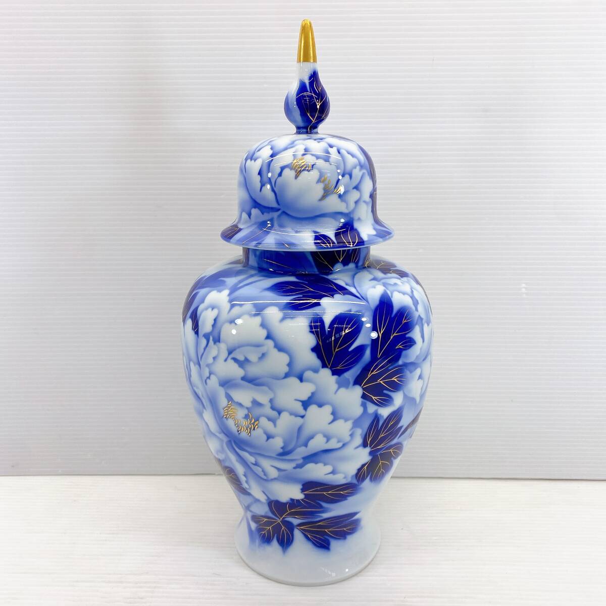 - ★深川製 金彩染付 冠付 牡丹図大花瓶 高さ約41cm 中古品★