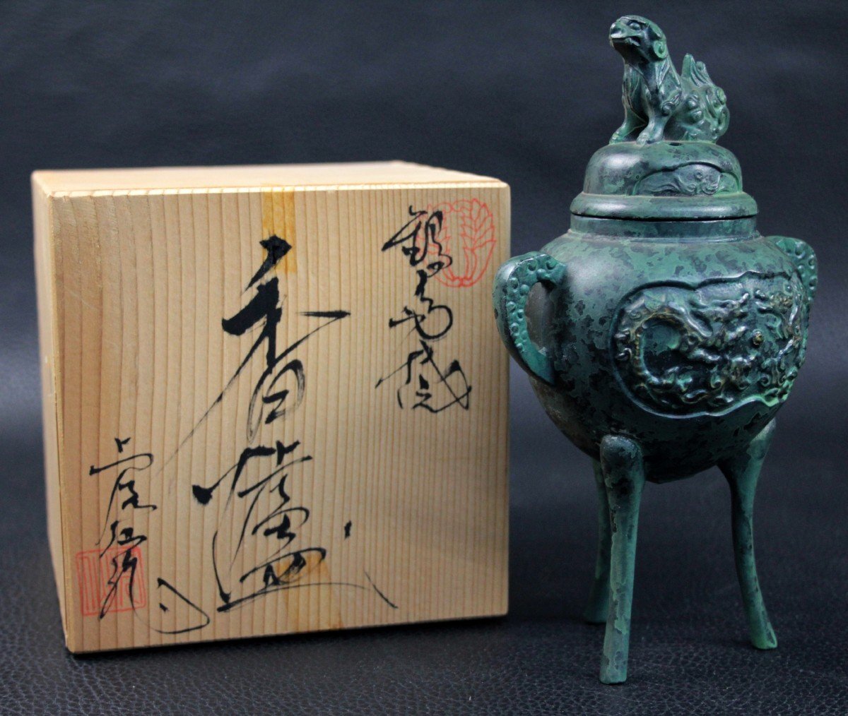 - 高岡銅器 香炉 三足香炉 獅子 龍紋 銅製 茶道具 三つ足 お香立 香道具 レトロ アンティーク コレクター 金属工芸 工芸品 骨董品