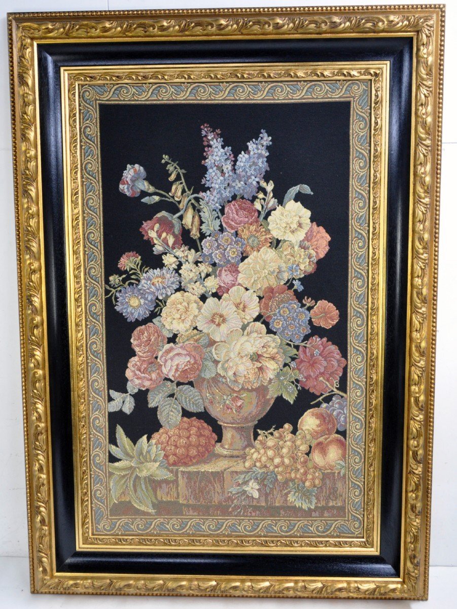 > ゴブラン織 タペストリー 花柄 額装 大判 額サイズ約幅97×高さ137[cm] ブラック 刺繍 織物 壁掛け イタリア製 アンティーク コレクション