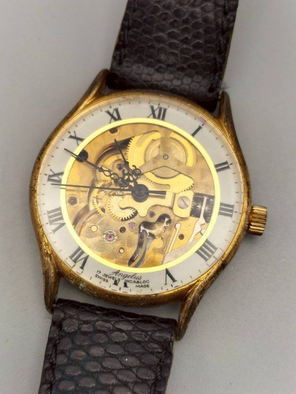 - R7-664 1円~ 稼働品 アンジェラス Angelus 手巻き スケルトン 腕時計 メンズ ゴールドカラー 社外革ベルト