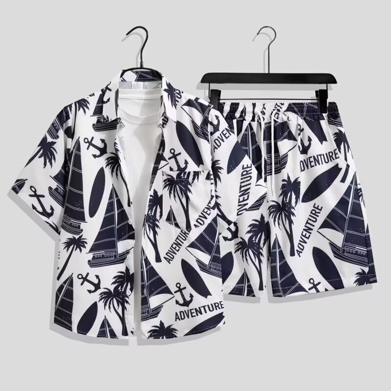 - 半袖花柄シャツ ショートパンツ 上下セット イタリア製造・ミラノ発◆通気 ソフト 薄手 短パン 夏 ビーチ SIZE:2XL fz95