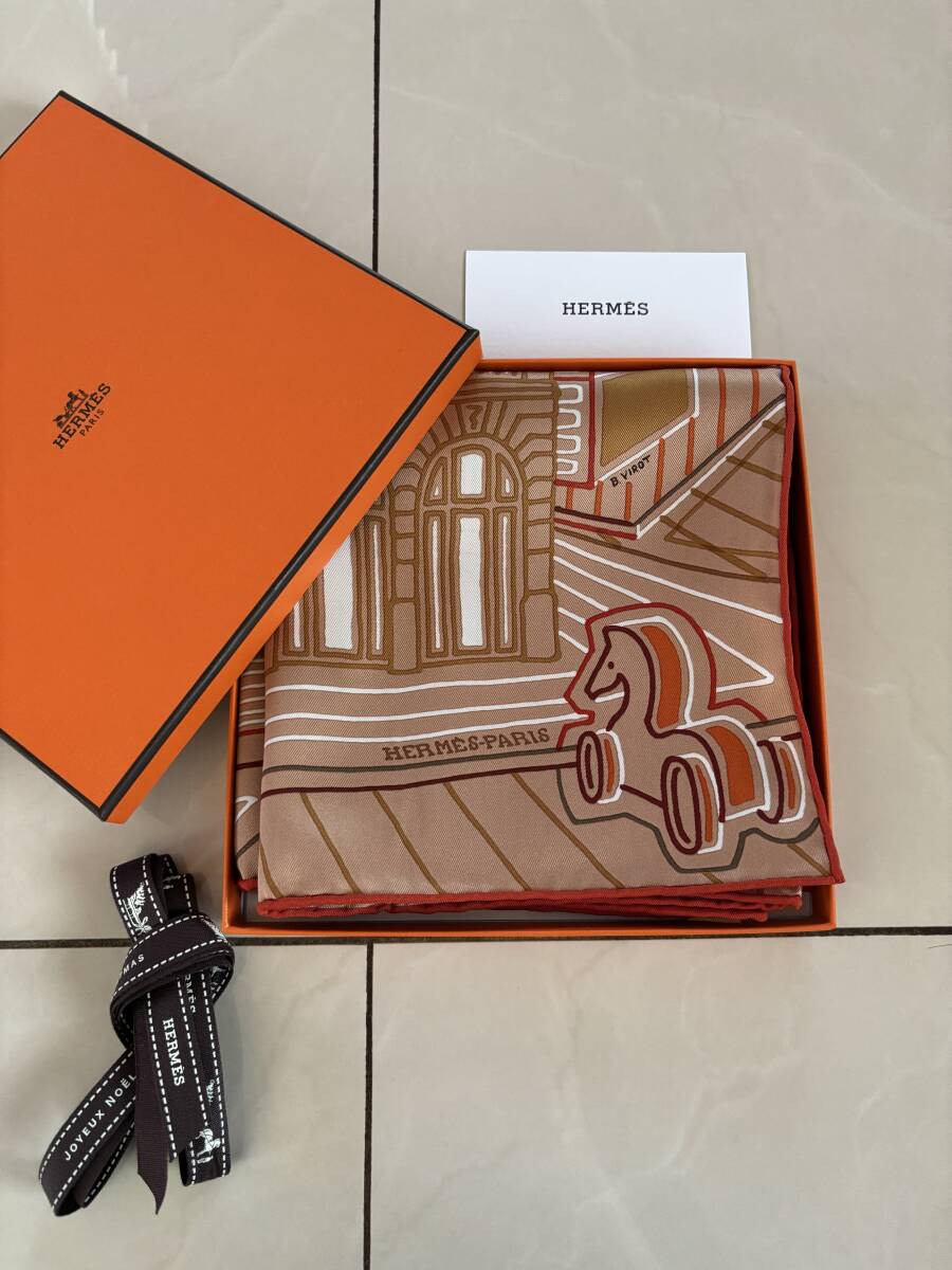 - HERMES★中古美品★エルメス カレ70 <フォーブル・シティ> キャメル系 オレンジ 白 シルク クリーニング済み