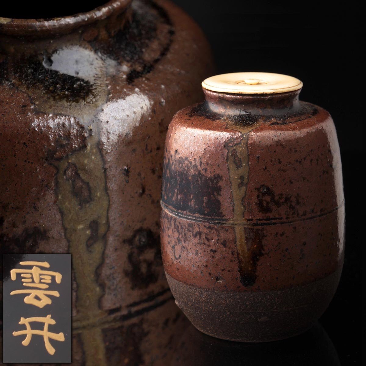 - FD999 江戸時代 古瀬戸肩衝茶入「銘 雲井」高8.5cm 牙蓋 仕覆 書附 塗共箱/木箱付・瀬戸茶入 茶道具 古陶 旧蔵 古美術