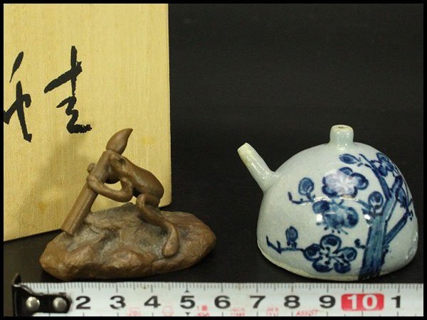 - 【銀閣】文房具 筆持蛙 紙鎮 水滴 二件 旧家蔵出 送料無料(A958)
