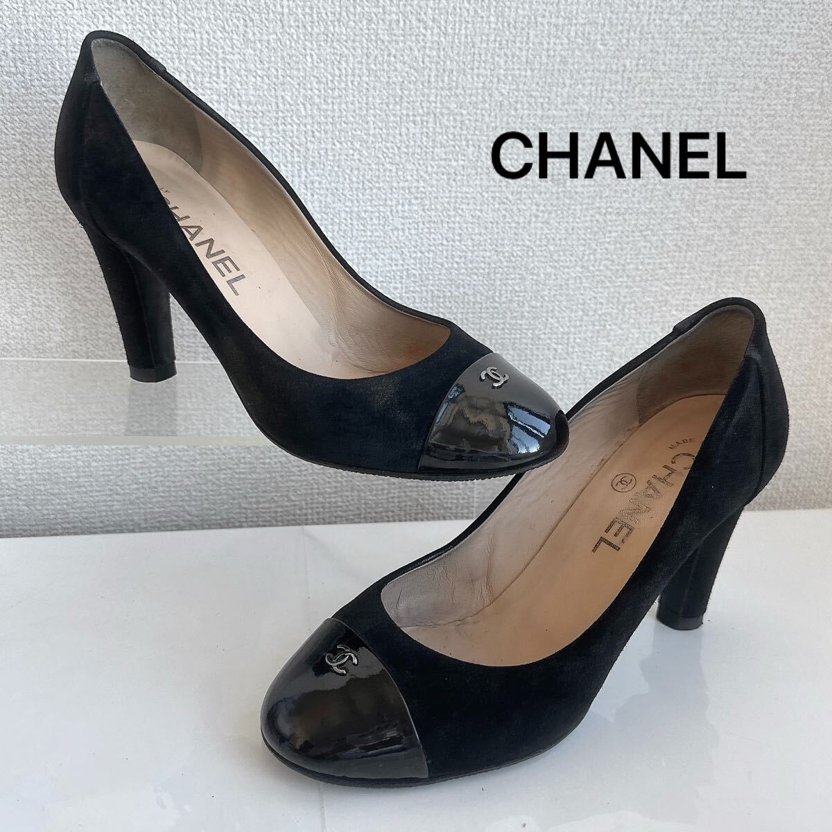 > CHANEL シャネル ココマーク パンプス サンダル ロゴ 太ヒール スエードレザー レーディス 靴 シューズ 35.5 ハイヒール 黒 ブラック