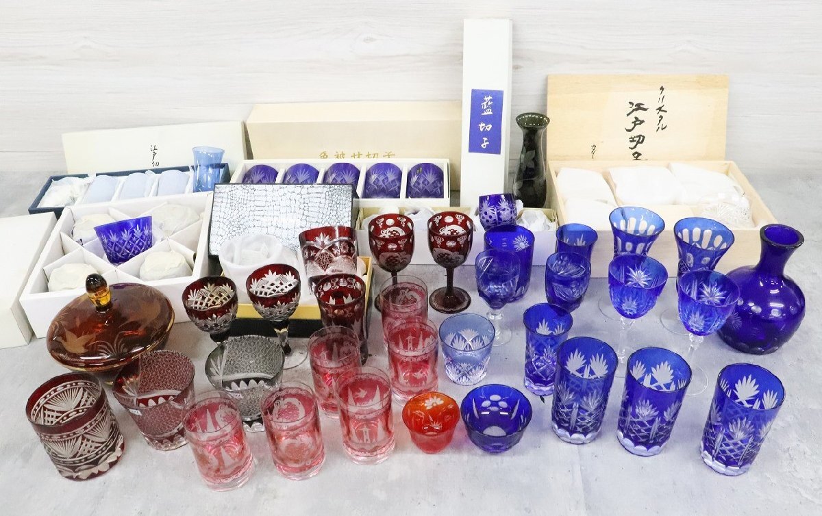 - 【行董】切子 大量まとめ クリスタル 江戸切子 カガミクリスタル ナルミ 藍切子 色被せ切子 花切子 伝統工芸 グラス 花瓶 等 AS000ABH23