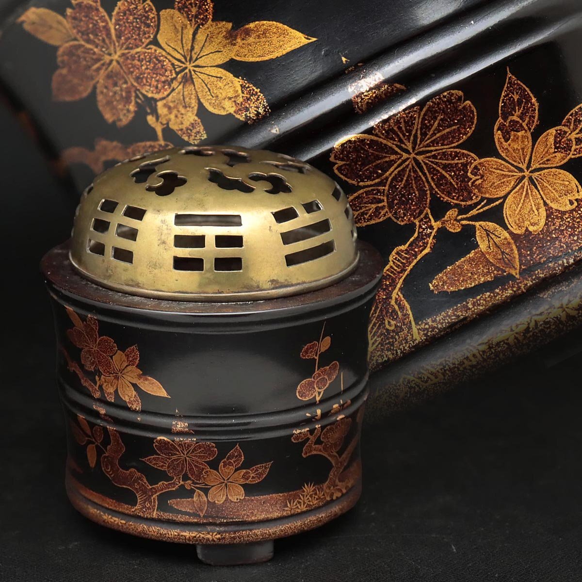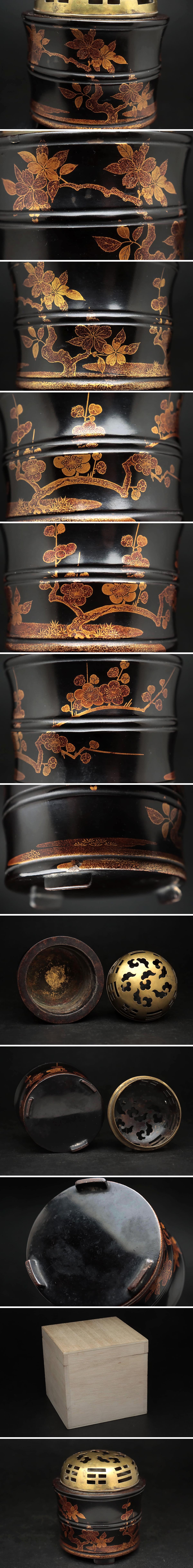 > EN668 時代漆器 雲算木透銅火屋 黒漆塗 梅桜図蒔絵 竹節形 蒔絵香炉 高8.8cm 木箱附・蒔絵香炉・蒔絵香爐 江戸 明治 香道具 煎茶道具