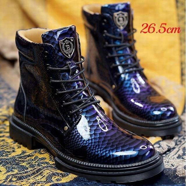 - ブーツ メンズブーツ シューズ マウンテンブーツ レザー 蛇柄 レースアップ エナメル バイクブーツ 滑り止め ブルー 26.5cm