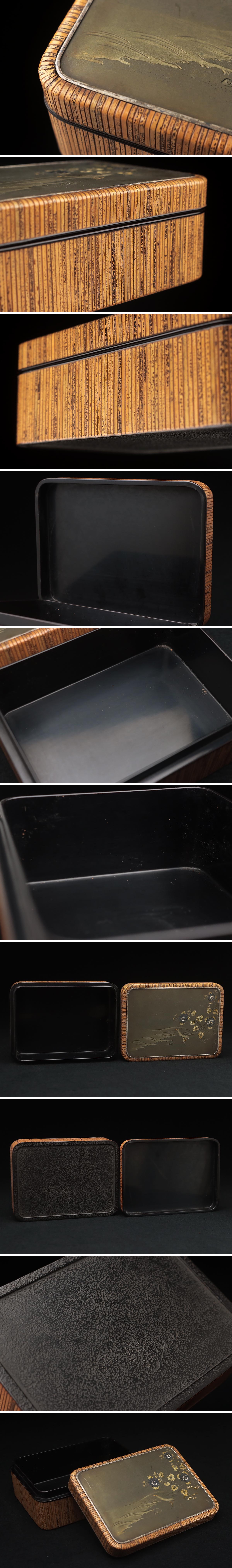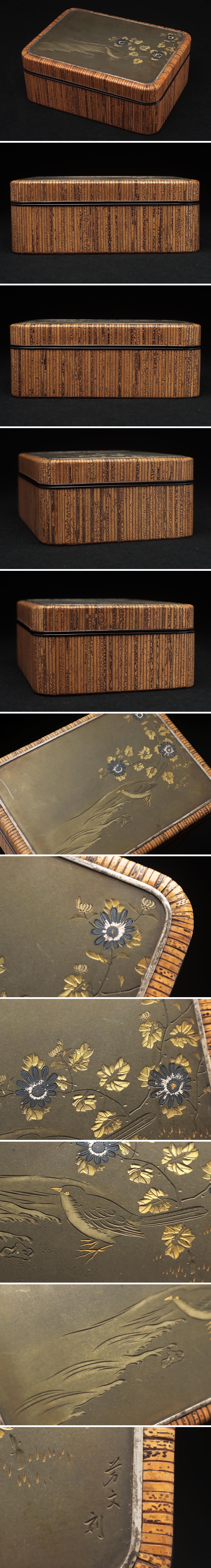 > FE133 時代喫煙具【芳文 刻】銀縁金工板 金銀象嵌 網代張 莨箱・花鳥図 銅板 胡麻竹張 煙草箱 幅14.3cm・巻莨入・小箱 古美術