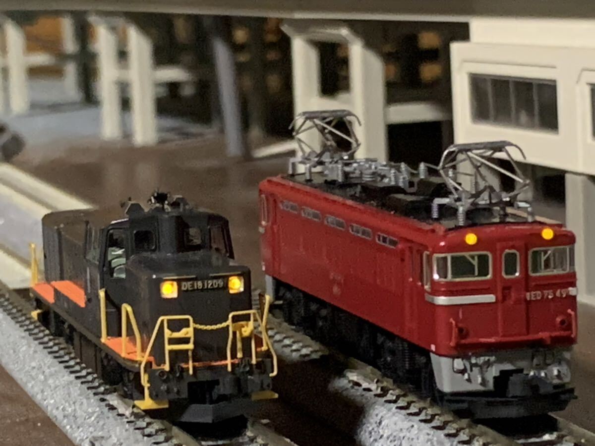 - tomix製DE10形ディーゼル機関車(JR九州色黒色塗装B、品番2230。tomix製ED75形電気機関車(ひさしなし前期型、品番9163) 計2両