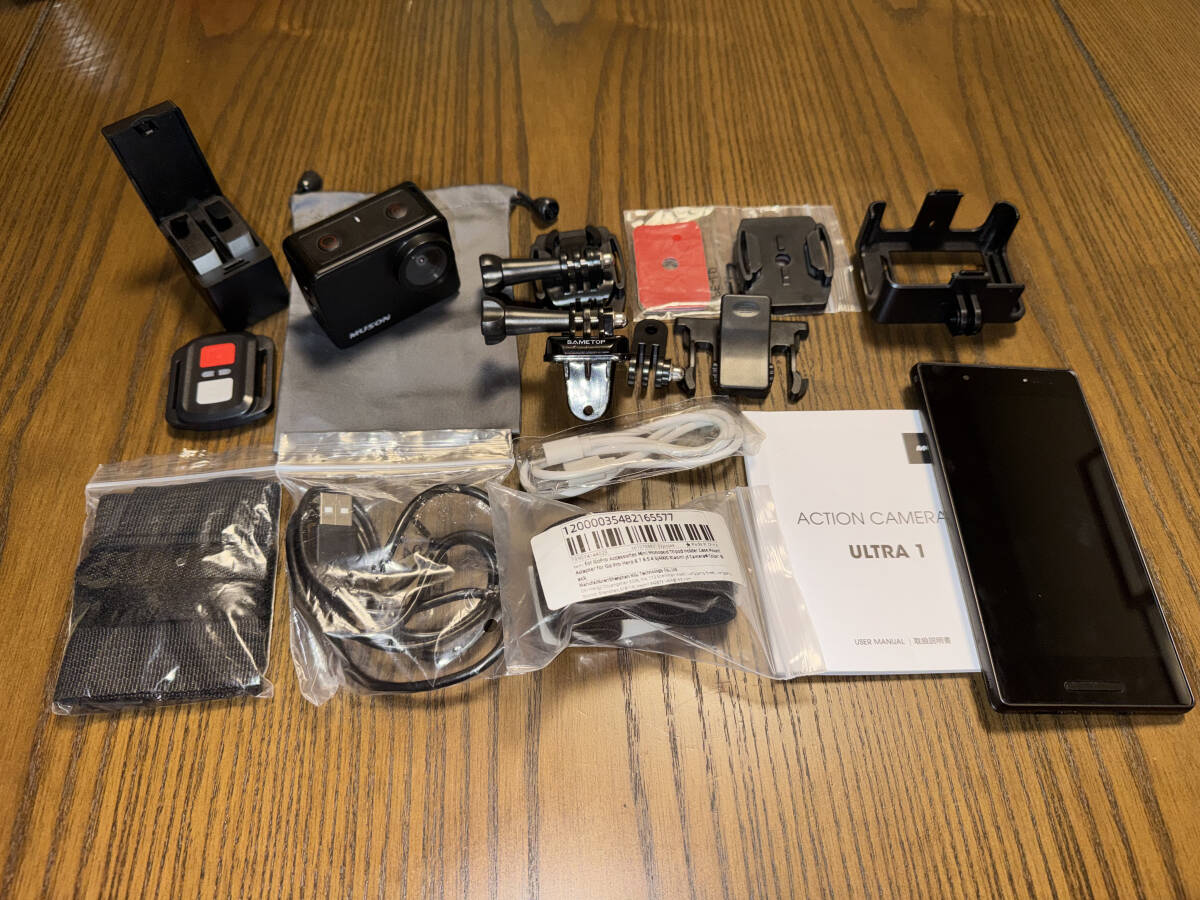 > 【ほぼ未使用品】MUSON Ultra1 4K アクションカメラ ワイヤレスモニター用スマホ付 カメラ 本体と付属品