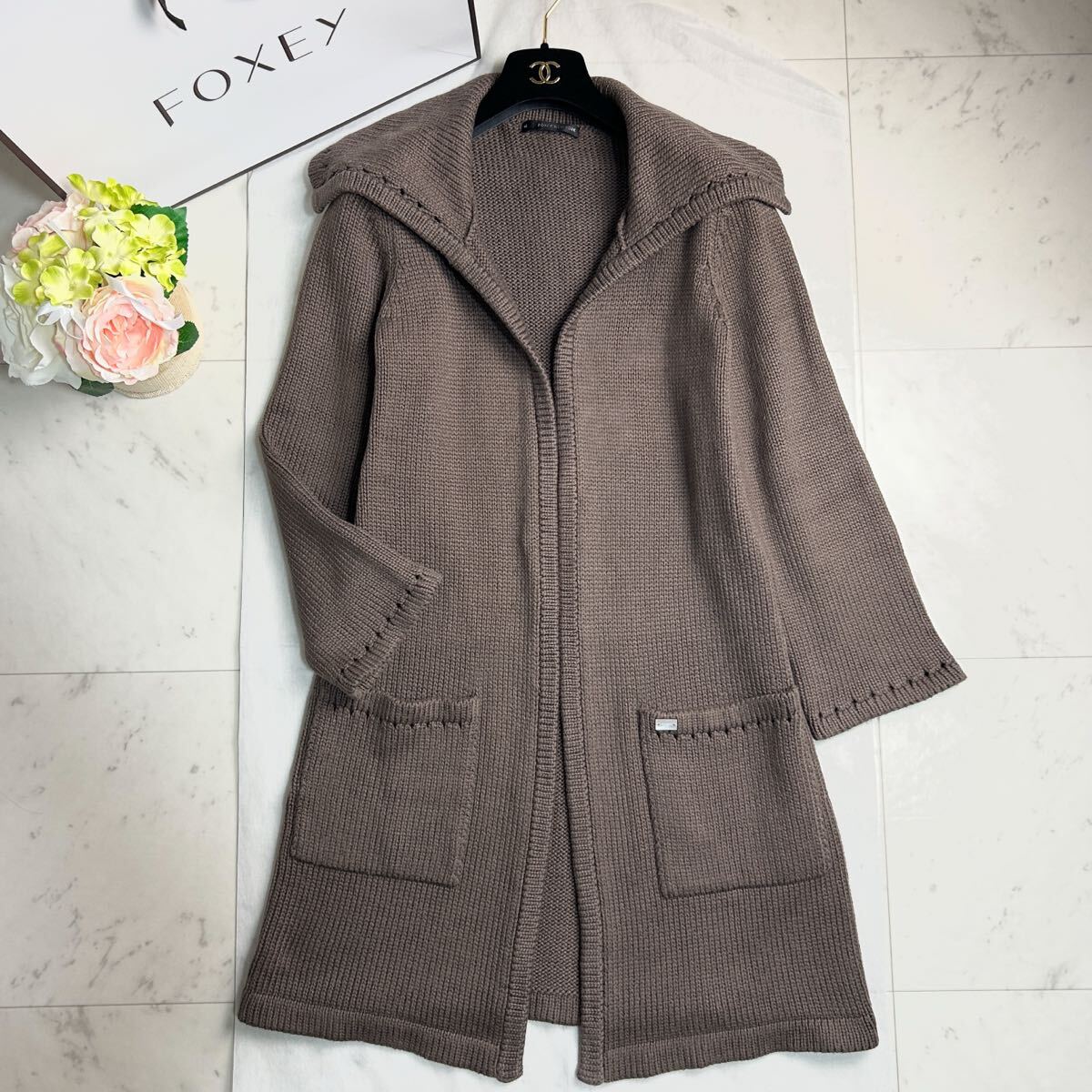 - 美品★FOXEY フォクシー★DM掲載★春に◎Wing Collarロングカーディガン★エンジェルヘアコットン★ウイングカラー ニットコート 完売40 XL