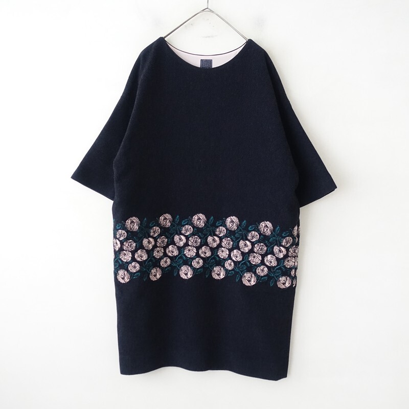 > ミナペルホネン mina perhonen *rosy 刺しゅうワンピース*38毛混チャコールネイビーノーカラードレス(25-2603-43)【13C62】