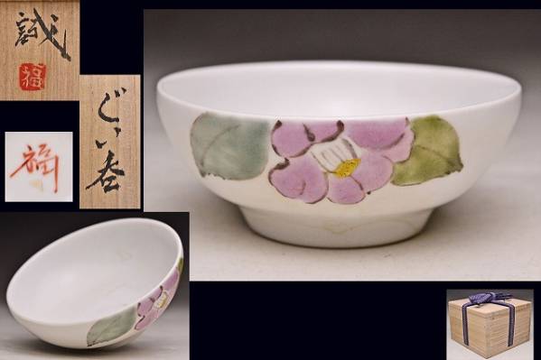 - 豊福誠 ★ 白磁色絵椿文ぐい呑 ★ 共箱 ★ 検 藤本能道 田村耕一 浅野陽 ★