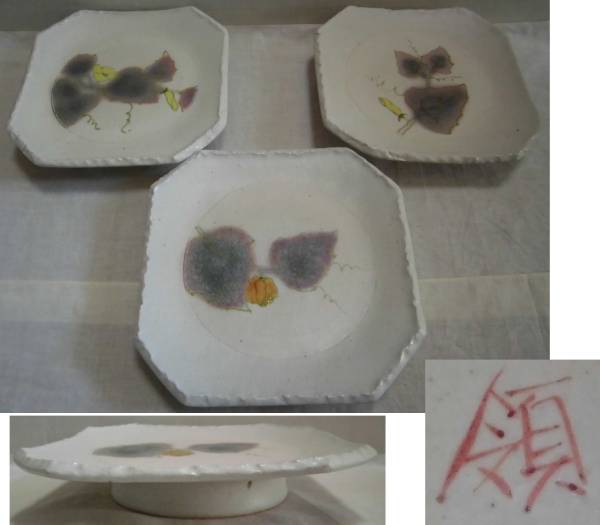 - ★レトロ 味わいある角皿 植物 柄違い 高高台 角皿 3枚 平皿 在銘 領 工芸品 陶器
