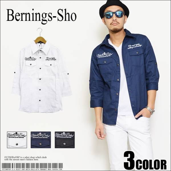 - スカル英字刺繍ミリタリー7分袖シャツ新品ネイビーM