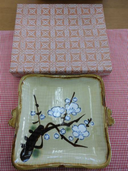- ●陶器 角皿 正方形 梅の図 耳付 〈1客〉