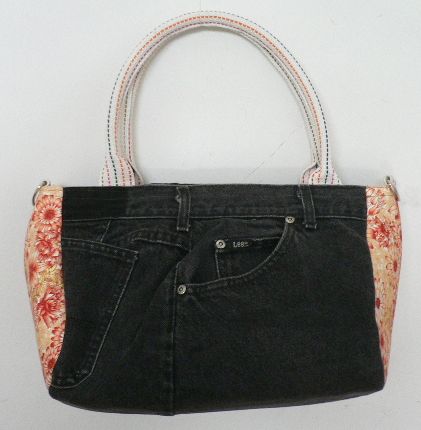 - ブラック ジーンズ リメイク デニム2way肩紐付ショルダー花柄ハンドバッグ/1点のみ