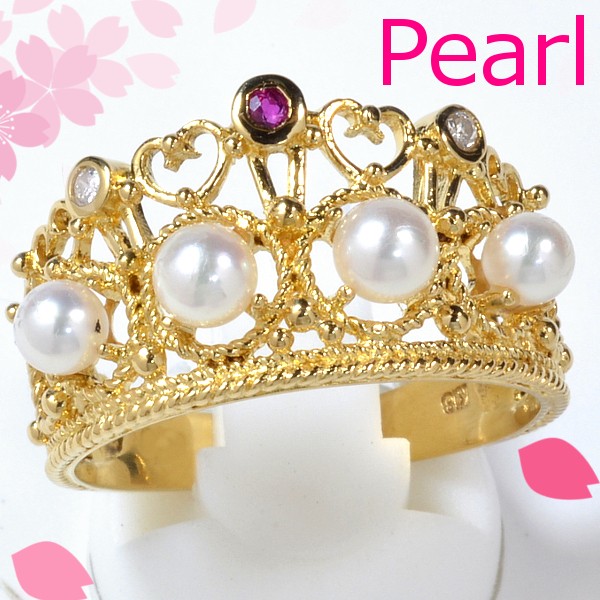 > 【早い者勝ち卸特価】【新品即決】K18あこや真珠約3.8mm~3.5mm/ダイヤモンド0.03ct/ルビーリング 指輪 ティアラ イエローゴールド PM015