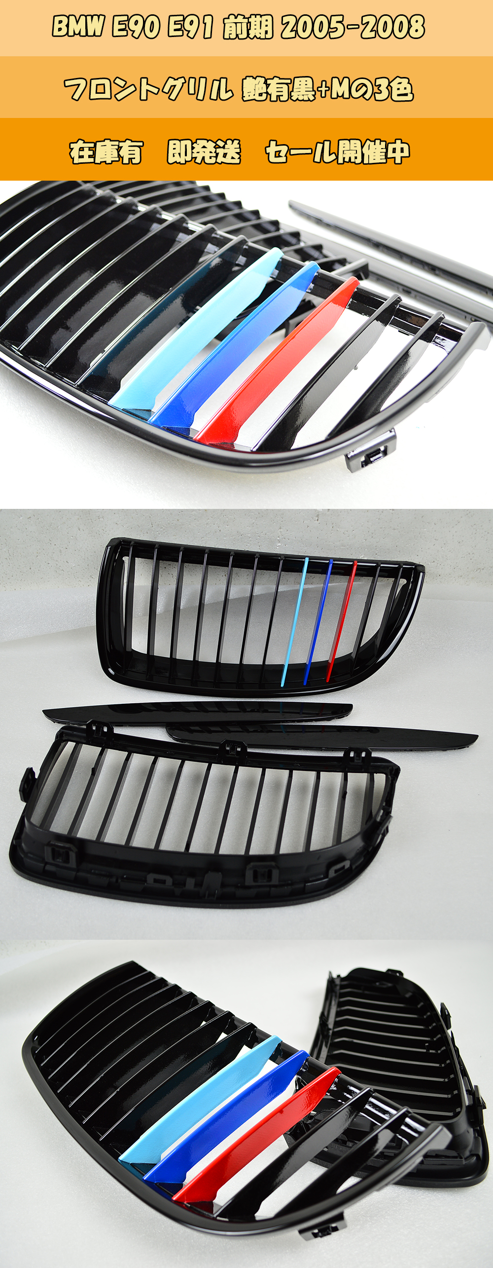 > 交換用左右 即納対応 取付簡単 BMW E90 E91前期 フロントグリル 光沢黒+Mの3色カラーABS 2005-2008