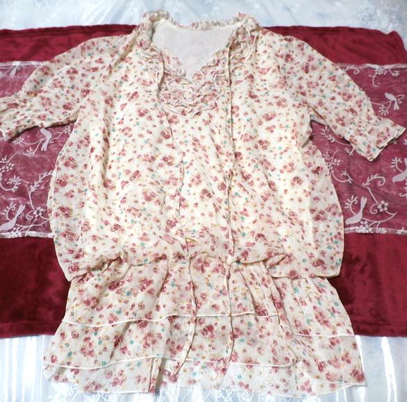 - フリルネック花柄ネグリジェチュニックワンピース Frill neck flower pattern negligee tunic dress
