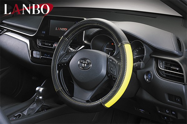 - LANBO デザインステアリングカバー ブラックカーボン調×イエローレザー