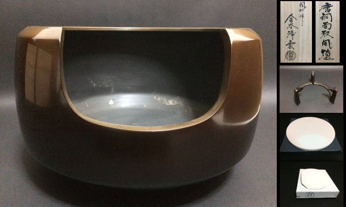 - H20 未使用 唐銅面取風爐 風炉師 金谷浄雲造 面取風炉 五徳・底瓦・前瓦付 共箱/ 茶道具 煎茶道具 茶席