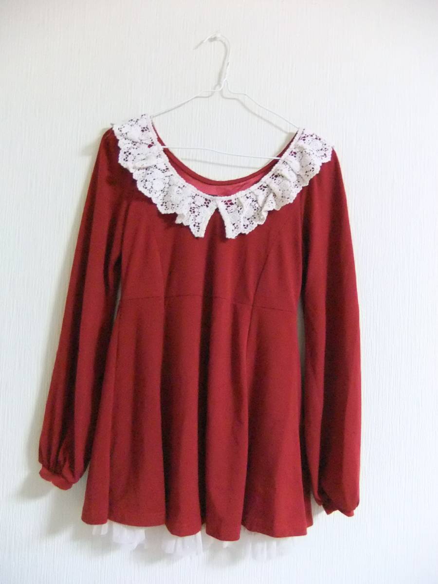 - ONE WAYワンウェイ★赤チュニックトップス★カットソー/キナリレース×ドット柄フリル