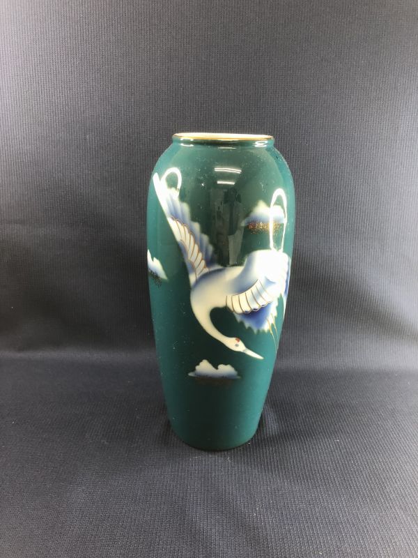 - 美品★ 鶴絵 金彩 花瓶 花器 深緑 管理1807 N-3
