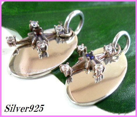 - シルバー925銀のジルコニア付クロスチャーム楕円プレート ペア ペンダント[ブルージルコニア&レッドジルコニア]2個set