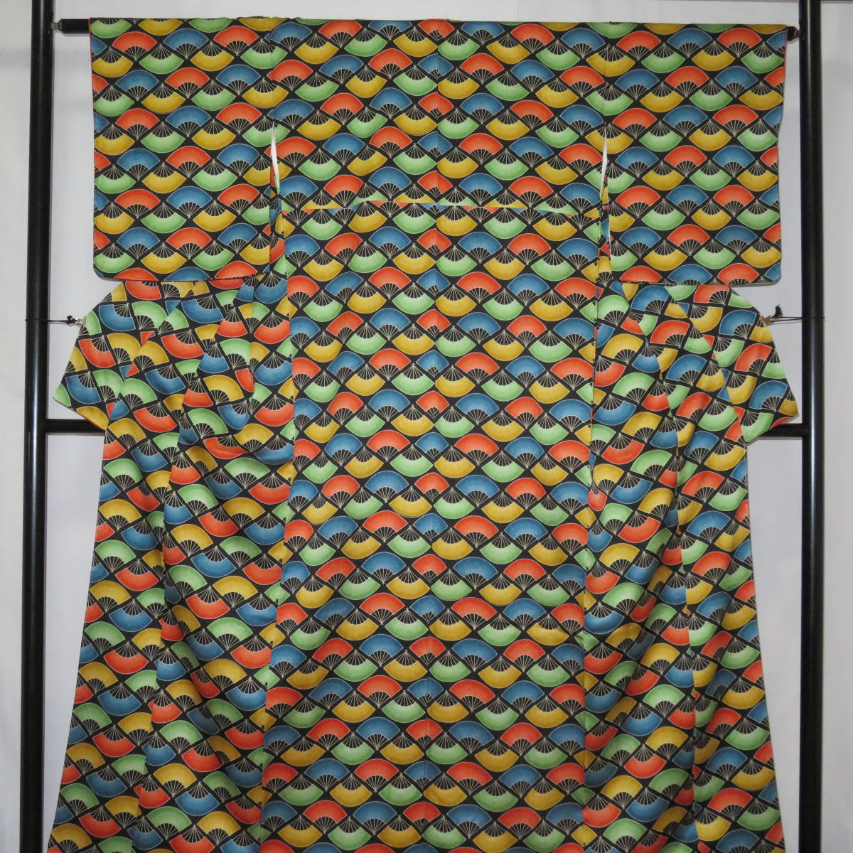 > 【桐輪】小紋*4配色の扇面文様☆送料無料☆新品*美品*仕付け糸付{正絹*袷仕立*小紋}*身丈161-裄64*黒地*4配色の暈し染の扇面*№2351319