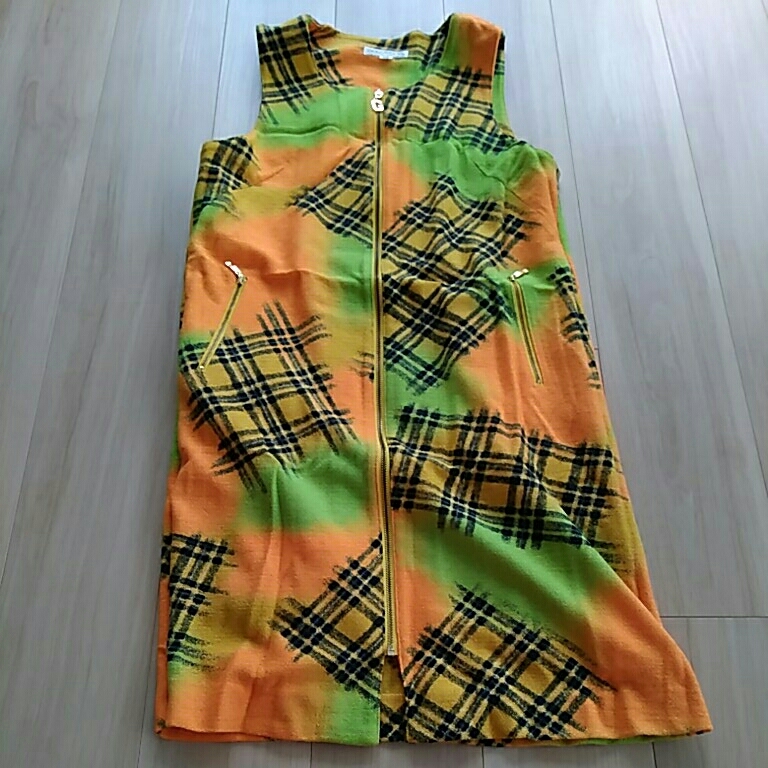 > ナイガイ GAYGIBSON ワンピース ロングベスト ジレとしても ファスナー ポケット付 裏地付 チェック オレンジ 毛100% 美品