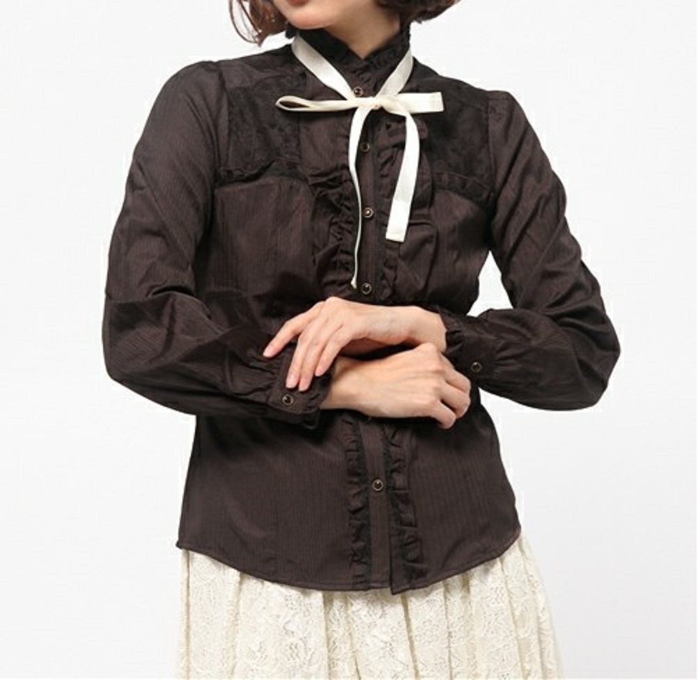 - 392◇ストライプドビーフリルブラウス 茶 ブラウン axes femme アクシーズ ファム TY91X73