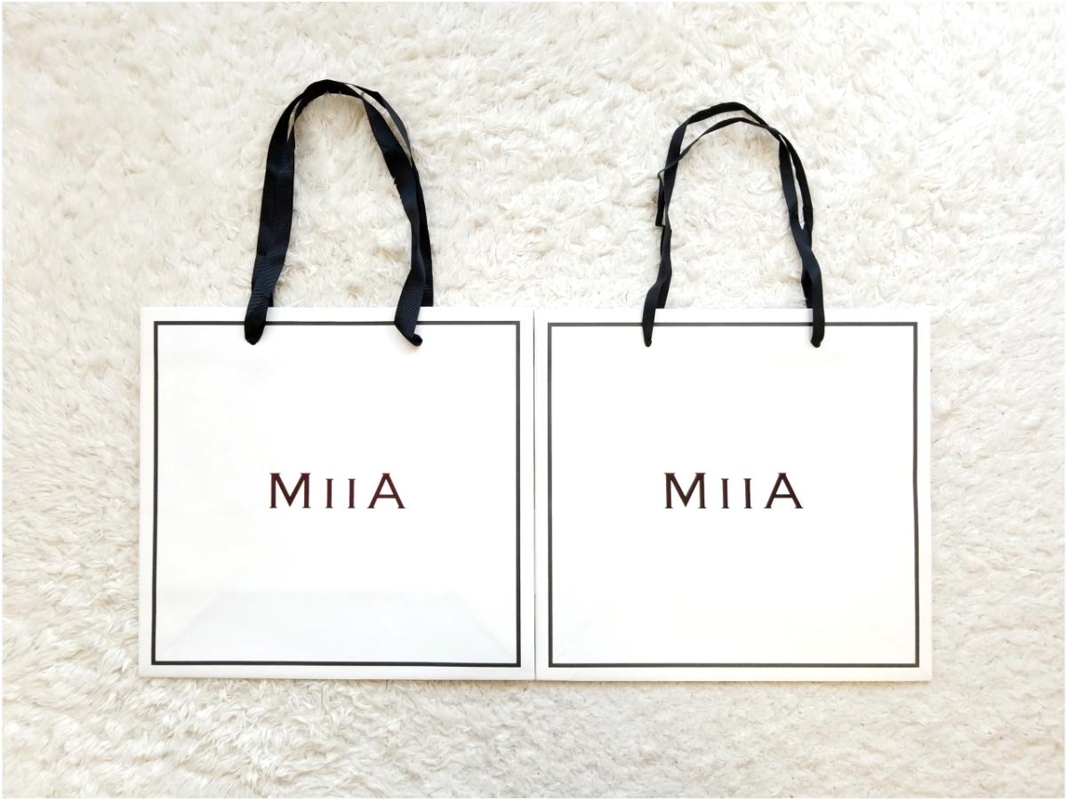 > ☆新品ミーアMIIAバイカラー白×黒ショップ袋2枚&おまけ保存袋1枚付き内側ストライプ希少ショッパー手提げ袋エコバッグギフトプレゼント☆