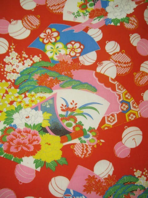 > 古布=143★朱赤*鈴*御所車*牡丹*菊*立花*交織*古布はぎれ★アンティーク