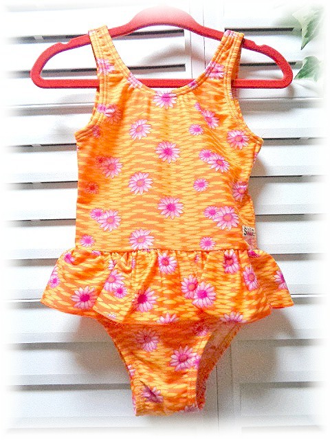 - ワンピース水着 ベビー90cm オレンジ×花柄 K
