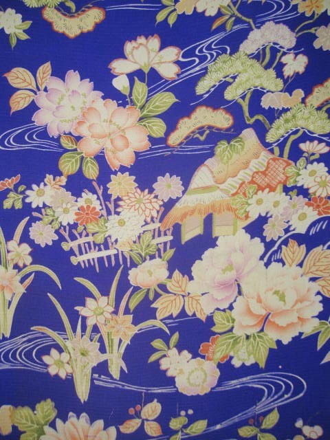 - 古布18=青紫*桜*牡丹*菊*水仙*松竹梅*綸子*着物*古布はぎれ★市松人形/吊るし雛