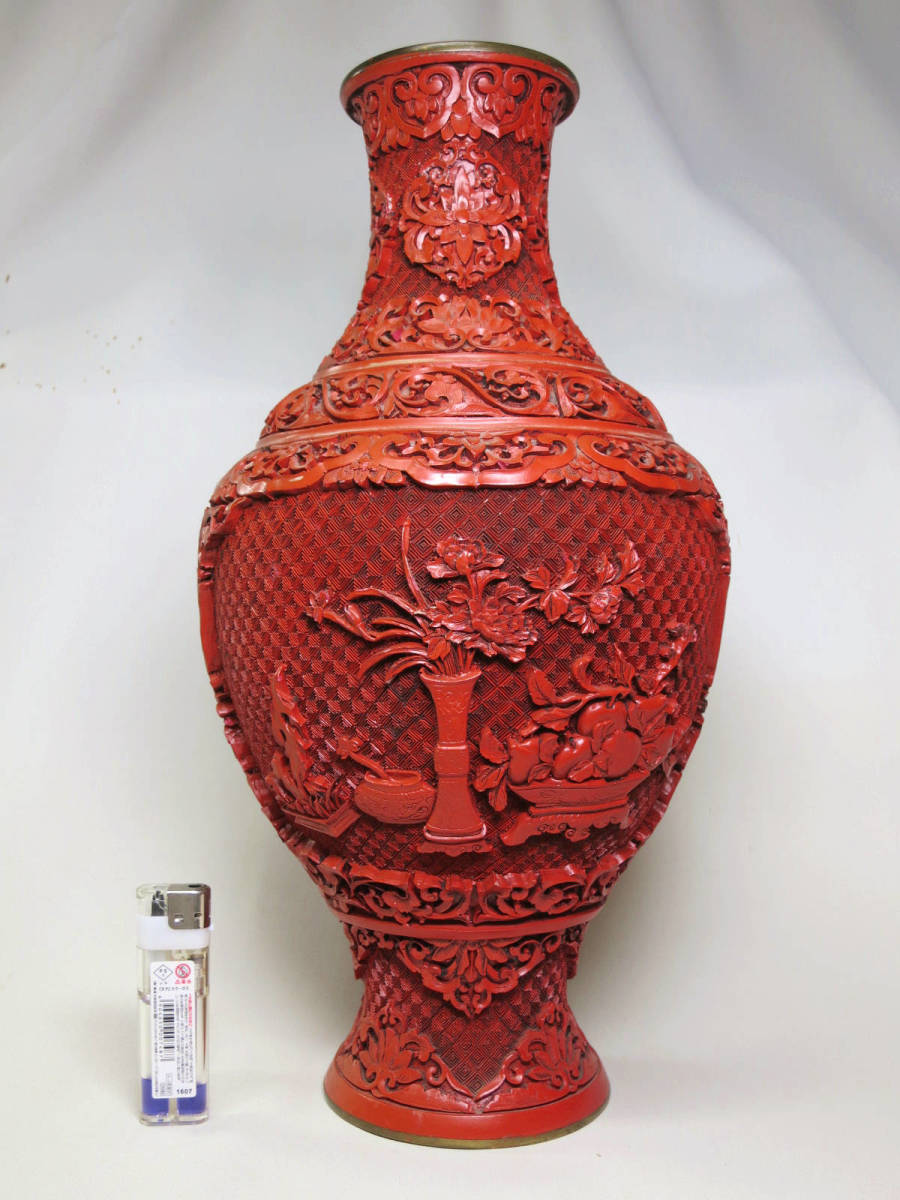 - [大幸] 台湾美術 銅胎堆朱盆景彫花瓶 上手 希少良品 高さ38cm TAIWAN 台湾堆朱 煎茶具 古玩 置物 彫刻