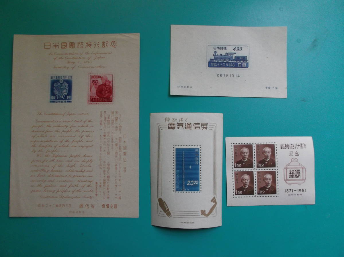 - 小型シート4枚組 日本国憲法施行1947.5.3 鉄道75年1947.10.14 電気通信展1949.5.11 郵便創始80年1951.4.14