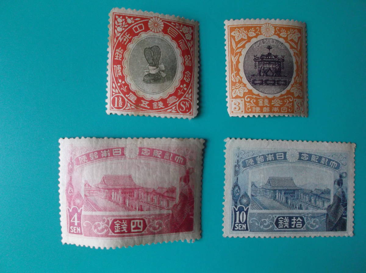 - 大正大礼 切手4種 式典の冠 たかみくら 紫宸殿式場2枚 1915.11.10 Enthronement of Emperor Taisho