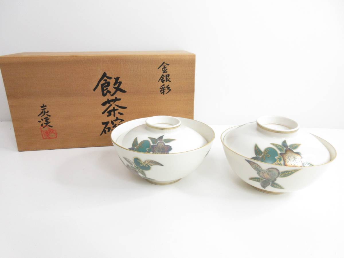 > 未使用品◆京焼 清水焼窯元 炭渓 今橋逸夫 飯茶碗 金銀彩 2セット 花柄 管理2002 B-15