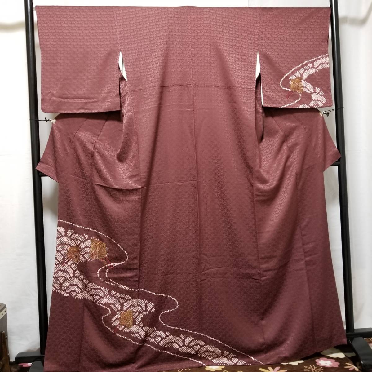 > 【桐徳】付下げ☆送料無料*手絞り.金箔文様{正絹*袷*付下げ}身丈170-裄67.5*ガ-ネット色地*手絞り-手刺繍-金箔の御所車と流水文様*№4363