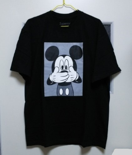 > Superior スペリオール Tシャツ 半袖 黒 口をふさぐ ミッキー MICKEY 28 前後プリント XL・身幅約58.5cm※USED品/2~3度使用/2015年製品