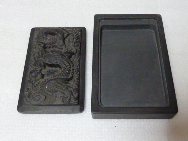 - SIW89◆ 龍彫刻蓋付き 硯 すずり◆ 書道具◆ アンティーク◆