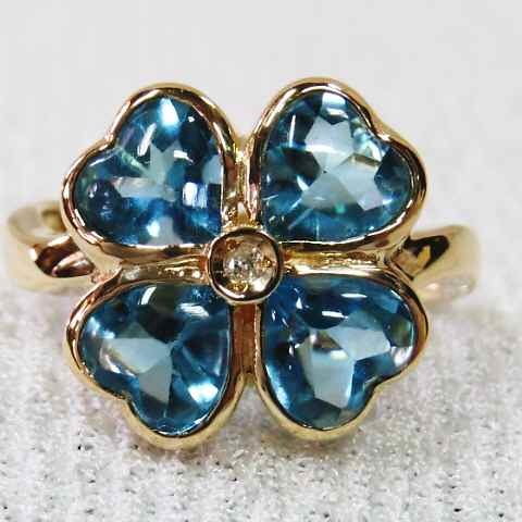> 【値下げ交渉は質問欄より】可愛い♪幸運の四つ葉のクローバー☆ブルートパーズ☆爽やかなデザインリング☆K18YG製ピカピカ指輪!!
