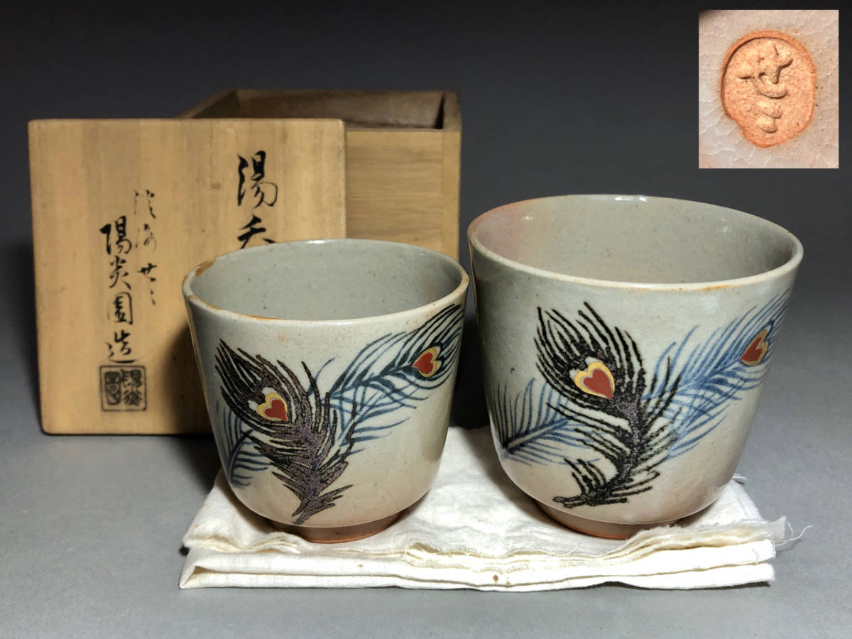 > K28 湯呑 膳所焼 淡海せ々 陽炎園造 岩崎新定 夫婦茶碗 金彩鉄釉染付 孔雀羽図 二客 共箱 遠州七窯
