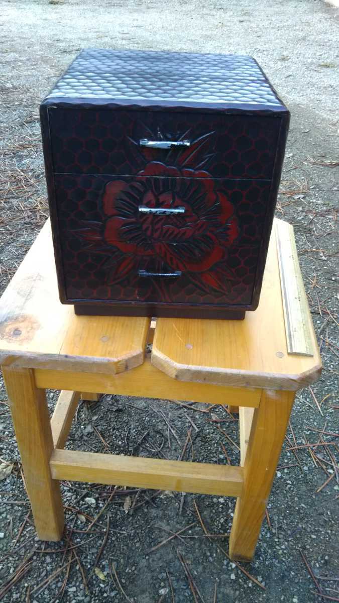 - 牡丹図案鎌倉彫り 三段引出し小物入れ サイズ【縦23㌢横22.5㌢高さ24.5㌢重さ2㌔】