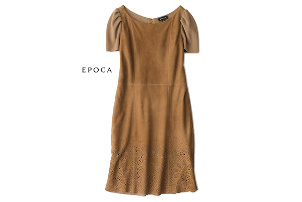 - 【美品】Epocaエポカ★バックボディウールニット伸縮 ゴートレザーレースフロント パフスリーブ ワンピース★総丈90㎝ 11号